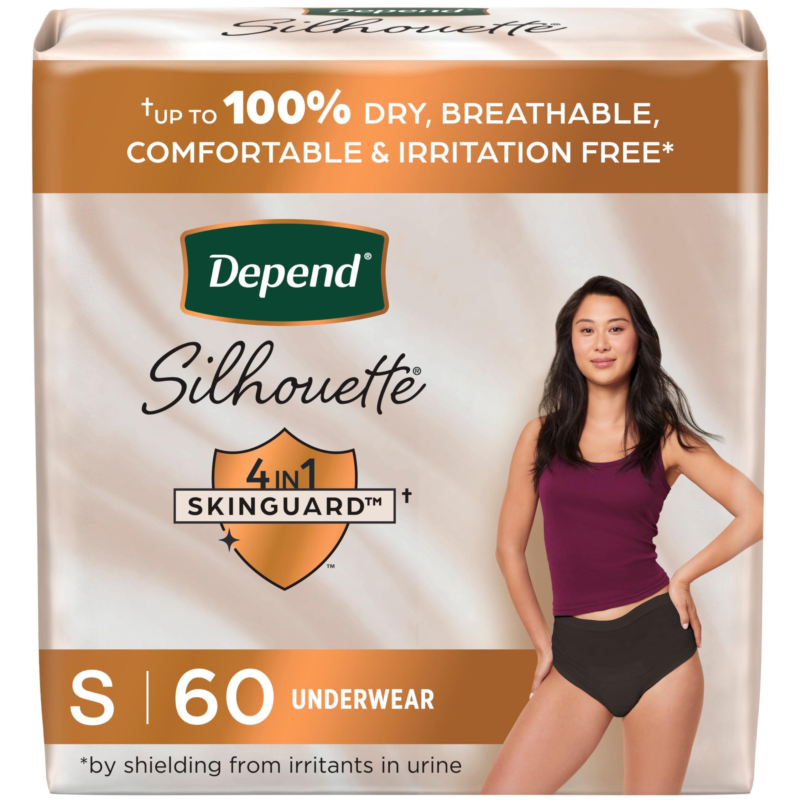 Take on bladder leaks with all-day trusted protection from Depend Silhouette Incontinence & Postpartum Bladder Leak Underwear for Women. This womens bladder leak protection features our best skin protection ever with unbeatable breathability. With 4-in-1 SkinGuard, Depend adult diapers for women are up to 100% dry, breathable, comfortable, and irritation-free by shielding from irritants in urine. Depend Silhouette incontinence underwear is made with breathable, premium, cotton-like fabric and a super absorbent core that instantly absorbs leaks to help keep you fresh. Our womens adult diapers also wicks away heat and moisture to help keep your skin dry. Plus, our incontinence underwear for women has an ultra-soft liner designed to be gentle on skin and comfortable leg elastics to help prevent leaks. Its designed with soft shapewear fabric that conforms to your body for invisible comfort and glides against skin to help prevent irritation. With a discreet fit that is unnoticeable under clothes for all-day confidence and trusted protection, you can look as great as you feel. Find your perfect look with four sizessmall (26-34" waist), medium (32-42" waist), large (40-52" waist) or extra-large (50-60" waist)and in a stylish pink color. Depend incontinence and postpartum underwear for bladder leaks is HSA/FSA-eligible in the US.