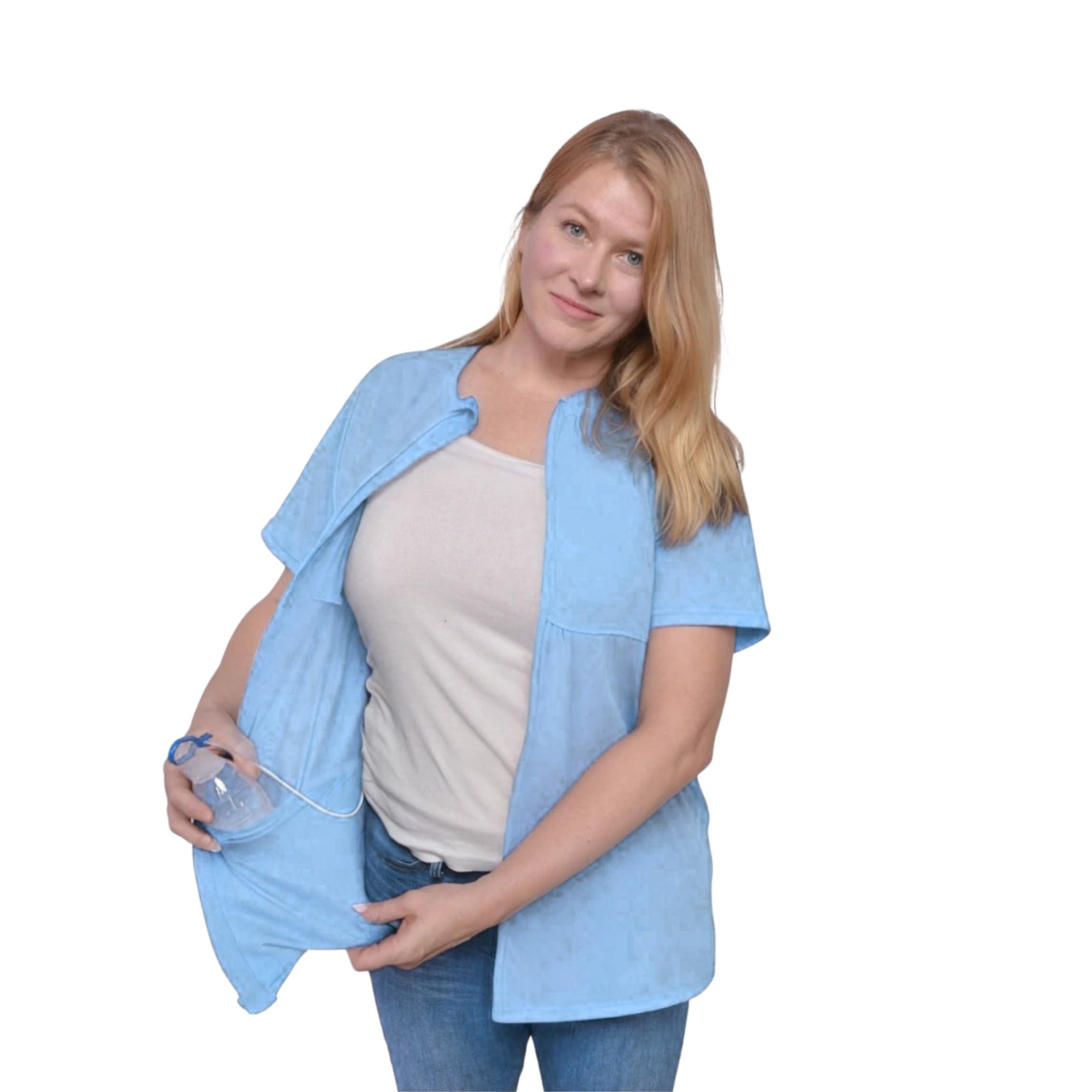 Mastectomy and breast surgery recovery shirt with easy open zipper and inner pockets for surgical drains. Designed to provide comfort, aid and maintain privacy for patients recovering from breast surgery and mastectomies. Soft comfortable cotton material, with lightweight hidden zippers offering privacy and ease of dressing. Pockets include fasteners to hold drainage tubes in place to prevent any entanglement. Larger size recommended to account for potential bandages or sites with dressing or for those who prefer a more relaxed fit. Ideal for patients, caregivers and medical professionals to help aid in recovery and healing.