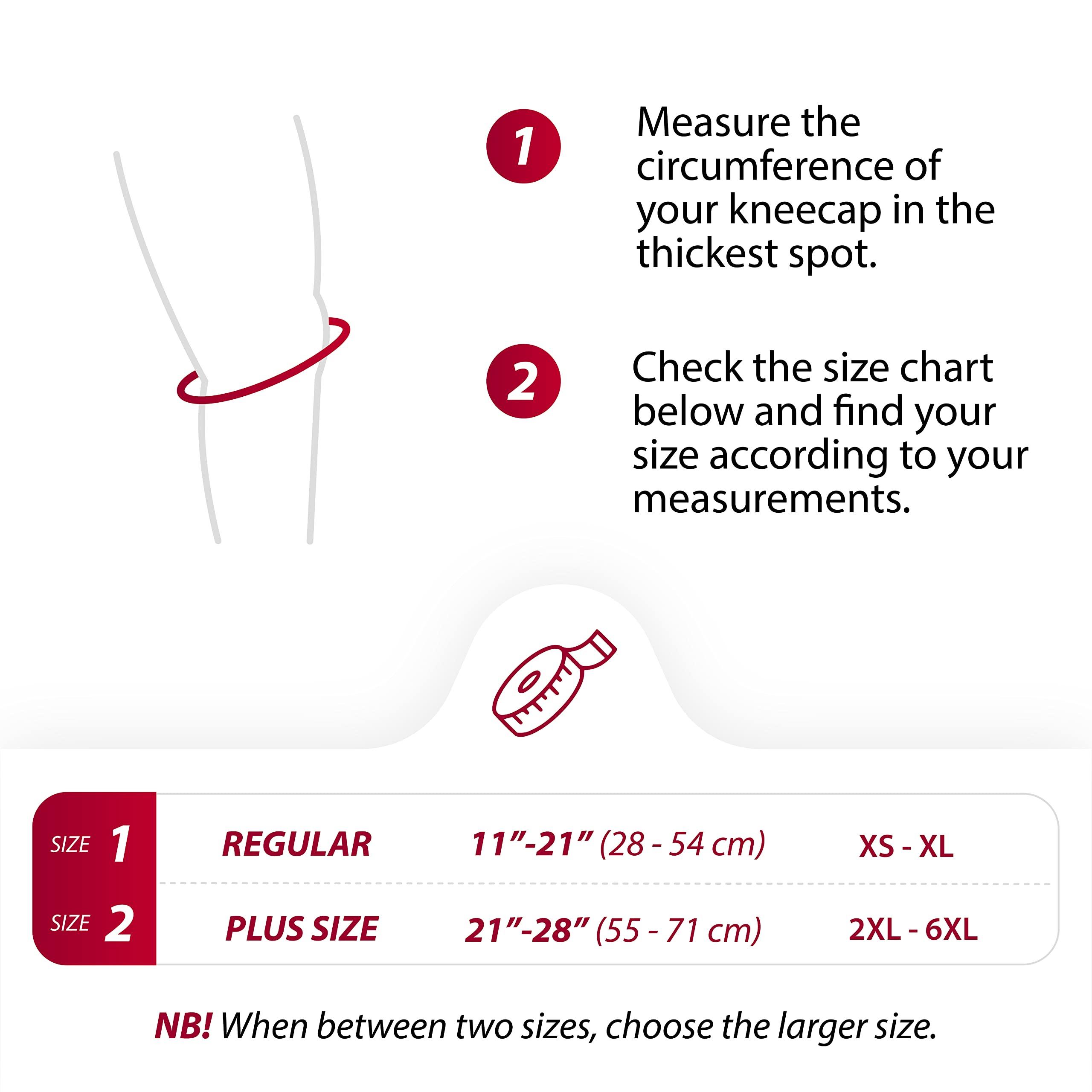 - Patella Tendon Knee Strap is sold in 1 piece and our Regular Size fits most XS, S, M, L, XL size Women & Men. Follow the size chart displayed in the photos section of the product page. A regular size strap is for you, if the measurement from the thickest part of your knee cap is between 28 - 54 cm.